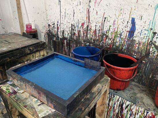 Mir ist nicht ganz klar, was mir Nick zeigen will, als wir vor dem Textilzentrum parkieren. Doch als wir hinein kommen, bin ich fasziniert. Im ersten Saal werden Stoffe bedruckt. Mit Handmodels die aufeinander abgestimmt sind. Es sind verschiedene Farben, die so nacheinander auf den Stoff gedruckt werden. Das braucht eine ungeheure Konzentration, denn mit einem falschen Druck ist das ganze Stück Stoff zerstört.