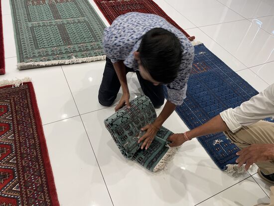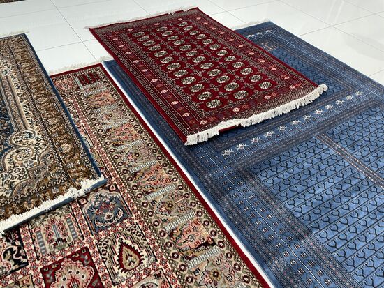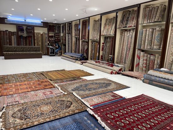 Da es sich um ein Textilzentrum handelt, komme ich nciht umhin, auch noch die Teppichabteilung anzusehen. Sie sind wunderschön, vor allem die grossen Teppiche. Ich soll meine Schuhe ausziehen und darauf laufen. Wollteppiche, fantastisch weich und strapazierfähig. Zwei Männer drehen einen der grossen blauen Teppiche und zeigen, wie er seine Farbe ändert. Wie er blau schimmert, ein kräftiges Blau und von den anderen Seite glänzt. Auch wenn ich wieder einmal erzähle, dass ich nichts kaufen möchte, man könnte den Teppich auch verschicken. Schau nur, so klein wird er, wenn wir ihn zusammenpacken. Und er wiegt fast nichts, braucht keinen Platz und er wird auf dich warten, wenn du nach Hause kommst.