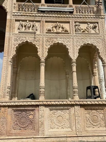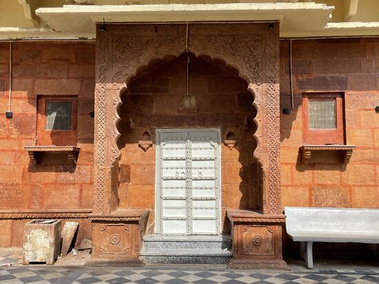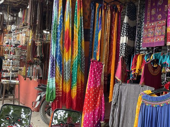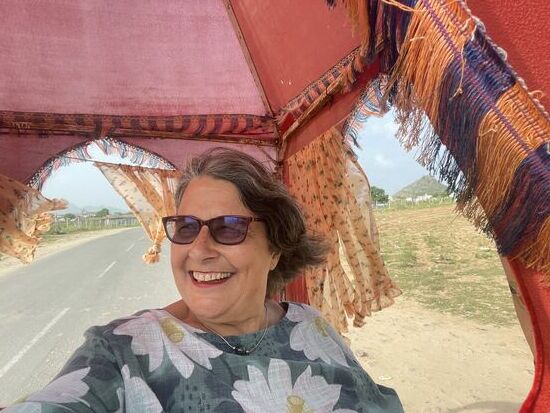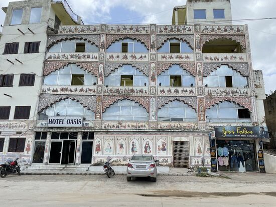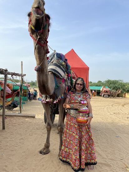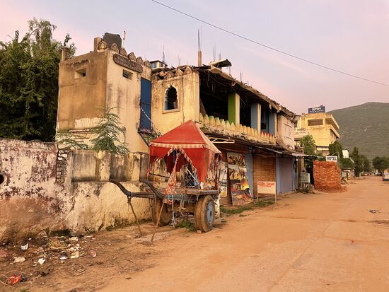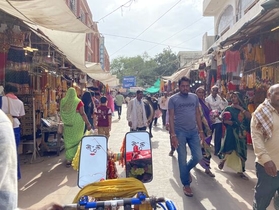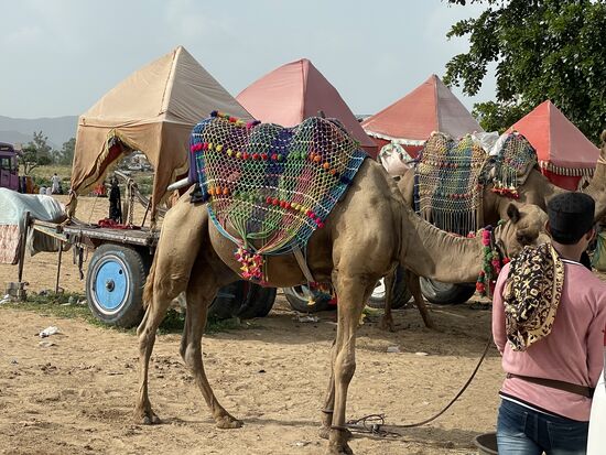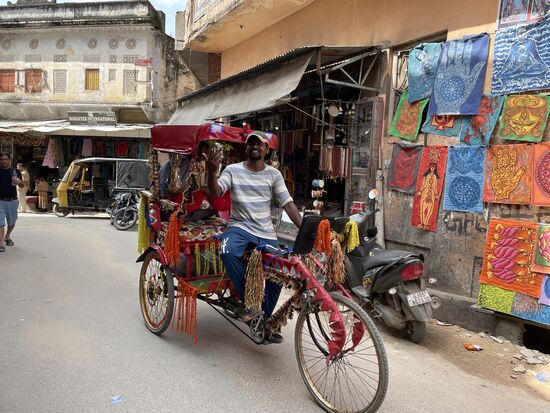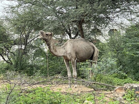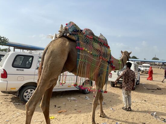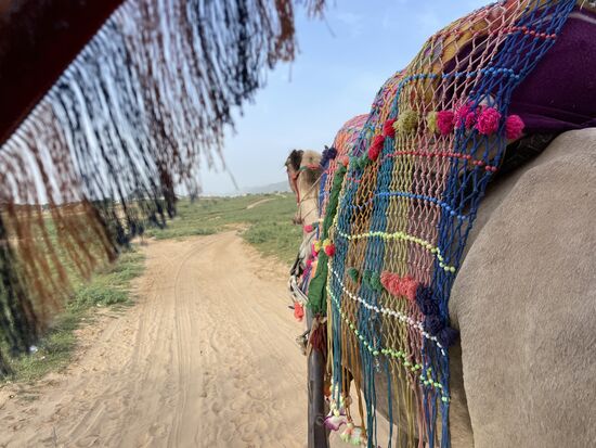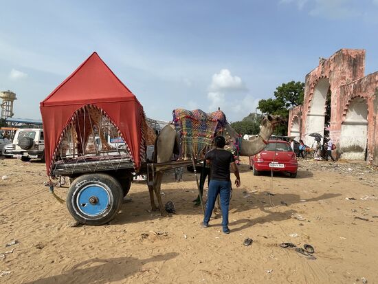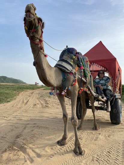 Saura, so heisst mein neuer Fahrer, lässt sein Kamel vor den Karren spannen und fünf Minuten später sind wir auf dem Weg in die Wüste. Jetzt ist hier alles grün, erzählt er, aber bevor der Monsun kommt ist hier alles Sand. So wie auf den Wegen, über die wir fahren. Vishnu heisst sein Kamel und es gehört ihm zur Hälfte. Er kennt es von ganz klein auf, fährt schon lange mit ihm, aber seit drei Jahren ist er am Gewinn beteiligt. Selbstverständlich schaue er gut für das Tier, denn es verschaffe ihm seinen Verdienst, seinen Lebensunterhalt. Während der Pandemie, als keine Touristen mehr kamen, hat er mit dem Tier auf dem Bau gearbeitet. Lasten getragen, Steine geschleppt. So schlecht war die Zeit gar nicht, meint er verschmitzt. Aber die Arbeit mit Touristen gefällt ihm besser.