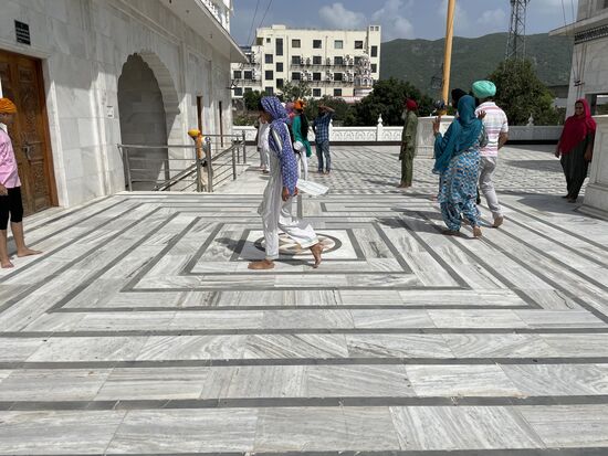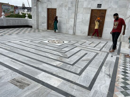 Der Platz vor der Moschee ist mit wunderschönen Platten belegt. Nachdem ich diese eine Weile betrachtet habe, entdecke ich ein Labyrinth. Auch ein paar der Gruppe haben es entdeckt und beginnen, den Linien entlang zu laufen. Immer mehr schliessen sich den ersten an, am Schluss sind alle auf dem Weg, nehmen all die Windungen, die Kehren und gelangen am Schluss in die Mitte.