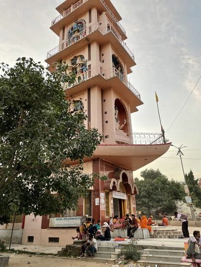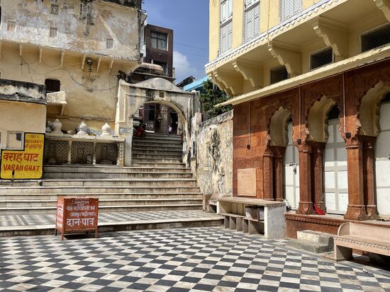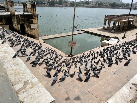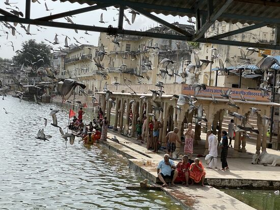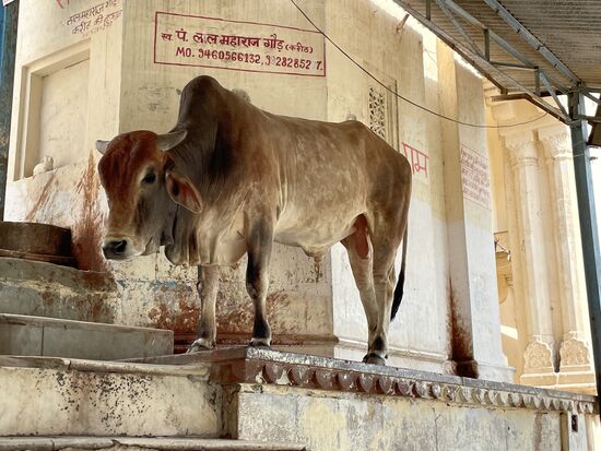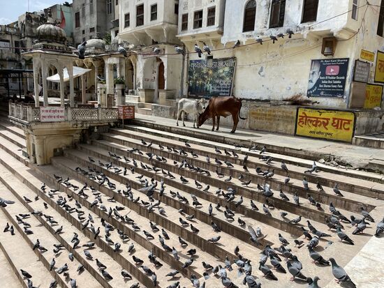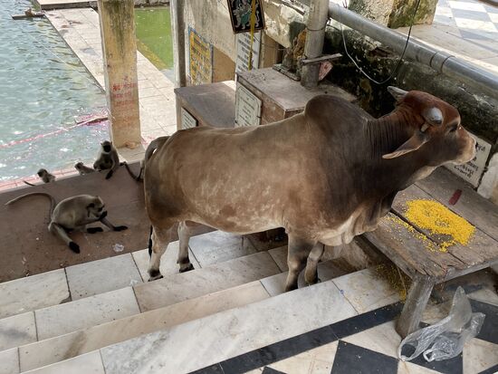 Ich sehe mich erst einmal um. Sehe die vielen Tauben auf den Stufen sitzen, sehe den rechteckigen offenen Säulen-Pavillon unten am Wasser, wo eine weisse Kuh gemütlich im Schatten liegt. Sehe den beiden Kälbern zu, die sich auf den obersten Treppenstufen begrüssen. Immer wieder eigenartig, diese Begegnungen mit Kühen, so weit abseits von vertrauten grünen Wiesen.
