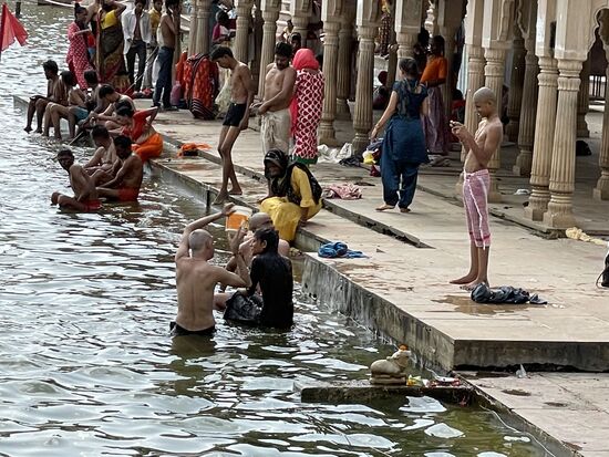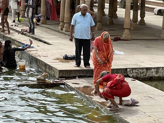 Auf der anderen Seite, beim Pavillion kommen inzwischen immer mehr Menschen. Sie setzen sich auf die Mauer, stellen die Füsse ins Wasser. Einige ziehen sich bis auf die Unterhosen aus, steigen ganz ins Wasser. Sie waschen sich, giessen sich gegenseitig Wasser über den Kopf.