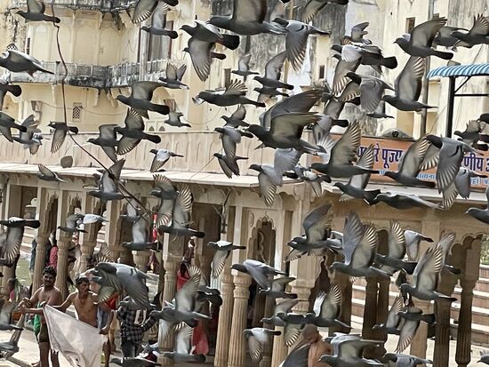 Auch Frauen sind dabei, sie steigen in den Kleidern ins Wasser oder bleiben beim Waschen der Füsse. Und in regelmässigen Abständen drehen die Tauben ihre Runde, fliegen alle zusammen auf, als ob sie jemand aufgeschreckt hätte, doch da ist niemand ausser den beiden Kälbern. Sie fliegen auf, verteilen sich auf den nahen Hausdächern und kehren bald wieder zurück auf die Treppenstufen.
