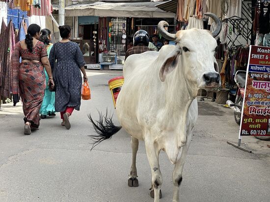 Eine andere Kuh nascht von gelbem Reis, den jemand ausgestreut hat, während hinter ihr ein paar Affen Possen reissen.