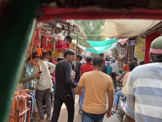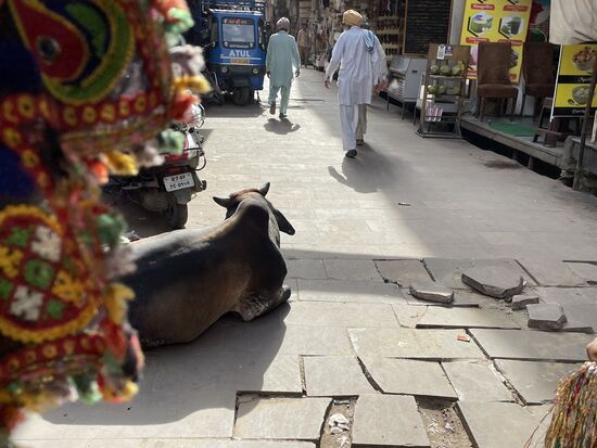 Ich gehe weiter und treffe kurz darauf den Rischkafahrer wieder. Eben noch hatte er Passagiere, jetzt ist sein Gefährt leer. Er lädt mich für eine Runde ein. Eine Runde durch das Dort, durch den Markt, zum Stadion und zurück hierher. Der Preis ist schnell verhandelt, ich steige ein. Er fährt tatsächlich durch den Markt. drängt sich durch die schmalen Gassen, auch wenn ich glaube, dass ich kaum zu Fuss durchkommen würde, vorbei an all den Verkaufsständen, den Kleiderläden, den Schmuck und Souvenirständen. Und vorbei an den Kühen, die natürlich auch hier, inmitten des Marktes gemütlich ihre Siesta halten.