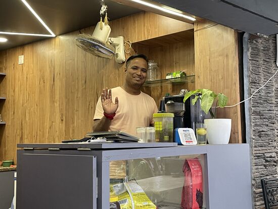 Sein kleines Cafe besteht schon seit vielen Jahren, aber jetzt ist er dabei, es wieder in die richtige Bahn zu bringen, nachdem es zwei Jahre geschlossen war. Überleben können wir immer, meint er lächelnd. Essen kostet bei uns nicht so viel. Aber er möchte seinen Betrieb verbessern, hat bereits eine neue Fassade aus Bambus erstellt.