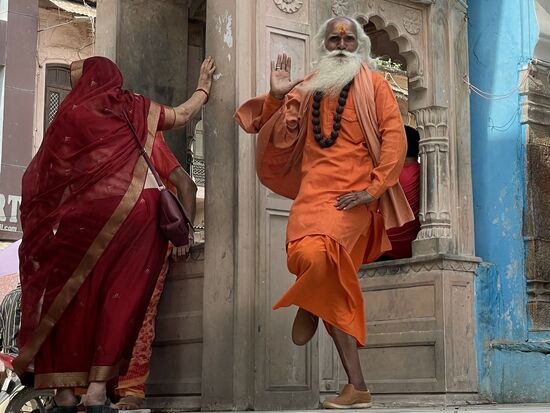 Als ich aufstehe und oben meine Schuhe wieder anziehe und durch das Tor den Ort verlasse, versucht ein orange gekleideter Mann meine Aufmerksamkeit auf sich zu ziehen. Er balanciert auf einem Bein und möchte wohl, dass ich ihm etwas dafür gebe. Doch ich habe ihn nicht gebeten, für mich den Clown zu spielen - auch wenn ich das Bild dankbar geschossen habe - und ich lasse ihn stehen. Tatsächlich ist es immer eine Balance, genauso wie er auf einem Bein steht, zu verstehen, wo ich etwas geben soll und wo nicht.