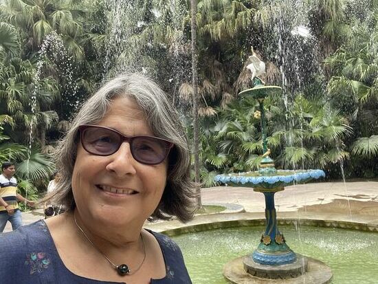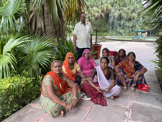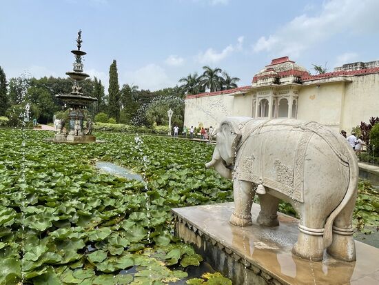 Einmal treffe ich auf einen ganze Gruppe Frauen, die sich gerade eben auf den Plattenweg gesetzt haben. Ob das die Harmensdamen sind, für die der Park gebaut wurde. Gebaut wurde er von einem der Maharadschas im 18. Jahrhundert für seine Königin und ihre 48 Hofdamen. Die Wasserspiele sind aus England importiert.