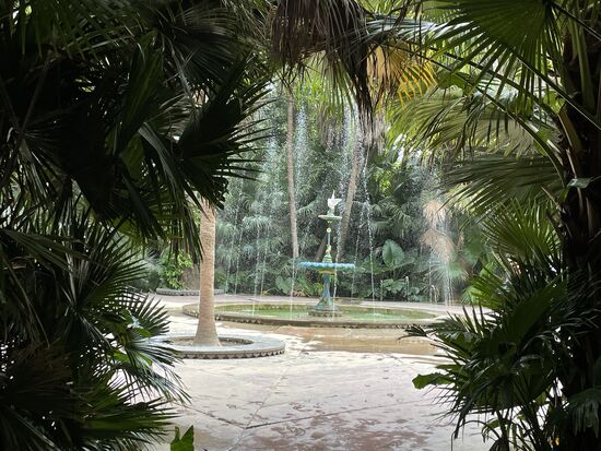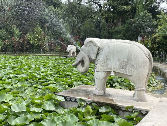 Beim grossen Teich mit den wasserspeienden Elefanten höre ich einem der Guides zu, der seiner Gruppe grad erzählt, dass die Wasserspiele auf Geräusche reagieren. Zur Demonstration klatscht er in die Hände und tatsächlich geht das Wasser zurück und bleibt dann ganz aus. Ein erneutes Klatschen lässt das Wasser wieder fliessen. Er lädt seine Gäste ein, es selber auszuprobieren. Es klappt nicht auf Anhieb, vielleicht hat die Frau zu wenig stark geklatscht. Beim zweiten Mal klappt es, das Wasser stellt ab, der Jubel ist gross, worauf das Wasser wieder einsetzt.