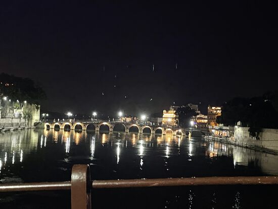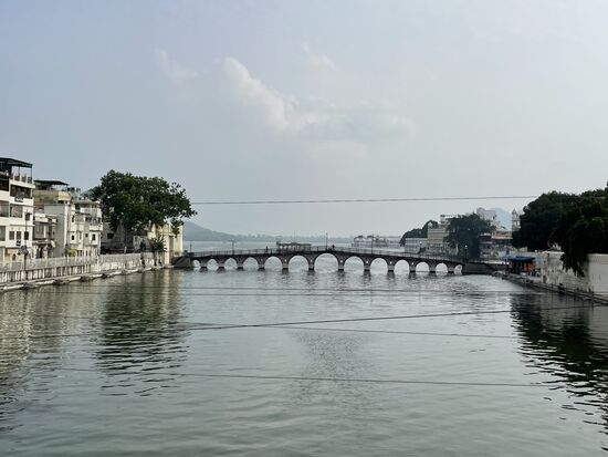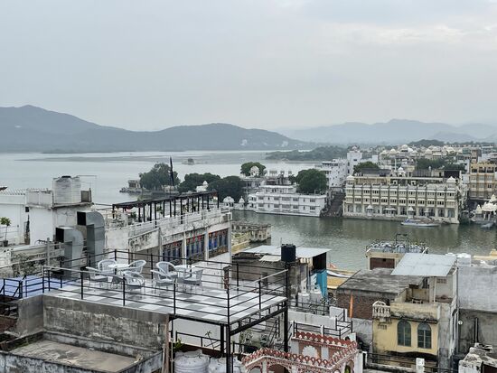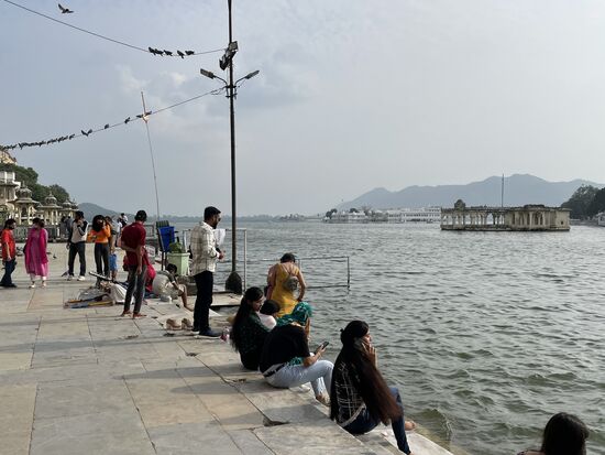 Wir fahren zum See, wo ich kurz aussteige und ein paar Schritte gehe. Da draussen kann man das grosse Hotel, einst der Palast eines Maharadschas, erkennen. Das Hotel diente als Kulisse für den James Bond Film Octopussy. Ich werde mir den Film bestimmt mit ganz anderen Augen ansehen, wenn er wieder einmal läuft. Für den Moment habe ich mir den Trailer angesehen.