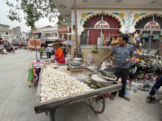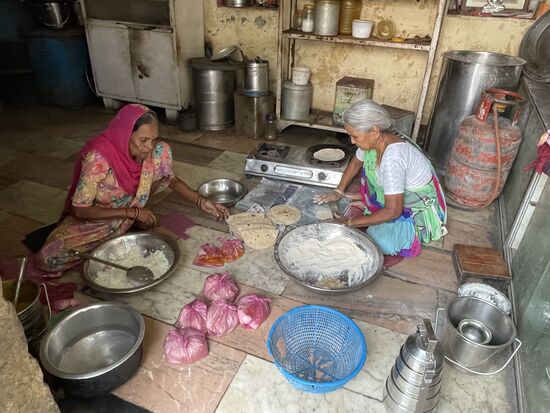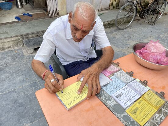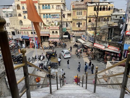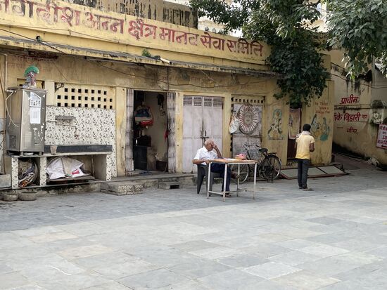 Auf dem Platz steht ein kleiner Tisch an dem ein Mann sitzt. Hinter ihm ist eine Türe offen und da innen werden den ganzen Tag gekocht. Gekocht für die àrmsten Einwohner. Sie können hier jederzeit eine Mahlzeit abholen. Vor allem am Morgen und am Abend ist der Ort sehr gut besucht, erzählt mir mein selbsternannter Guide und ich kann auch ein paar Leute sehen, die kommen und einen kleinen Plastiksack bekommen, in dem wohl etwas Reis mit Gemüse verpackt sind. Die beiden Frauen, die in der Küche am Boden sitzen, sind dabei, die Esswaren einzupacken, während der Mann draussen am Tisch Quittungen ausstellt, wenn jemand kommt und ein paar Rupien spendet, so wie die Familie, die gerade vom Tempel kommen.