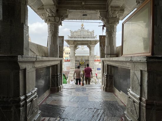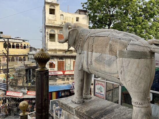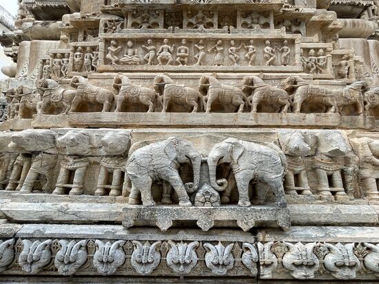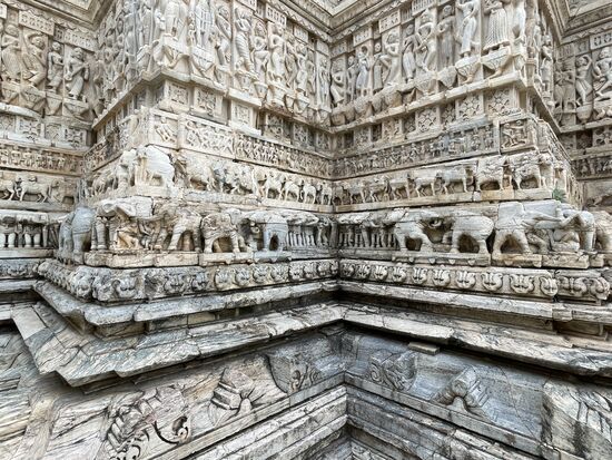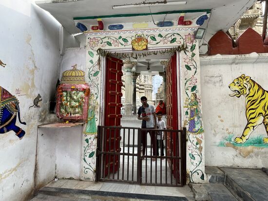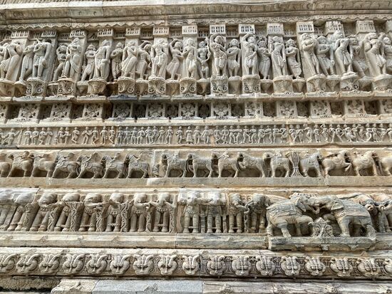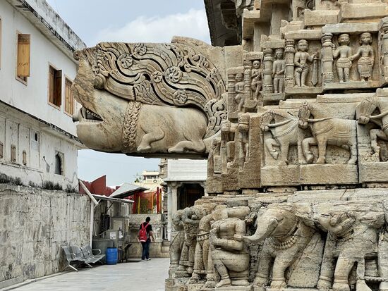 Wir fahren weiter und kommen zum Hauptplatz. Es ist der höchste Punkt des Ortes und hier steht der Jagdish-Tempel. Er ist dem Gott Vishnu gewidmet. Das erzählt mir ein Mann, der mich sofort in Empfang nimmt, kaum dass ich die hohe Treppe erstiegen habe. Er begleitet mich in den Tempel, weist mich an, hier nicht zu fotografieren und führt mich rund um den Tempel. Macht mich auf die reichhaltigen Ornamente aufmerksam. All die vielen Figuren, die sich rund um den ganzen Bau weiterziehen. Es sind Elefanten, Pferde, Götter, Tänzerinnen. Sehr eindrucksvoll, doch eigentlich würde ich die Fassade alleine ansehen. Leider kann ich den aufdringlichen Guide nicht abschüttelen, er weist mich auf die verschiedenen Götter in den kleinen Pagoden hin, sagt mir deren Namen und deren Bedeutung, die ich mir in der Schnelle nicht merken kann und dann kommen wir auf den Platz hinter dem Tempel.