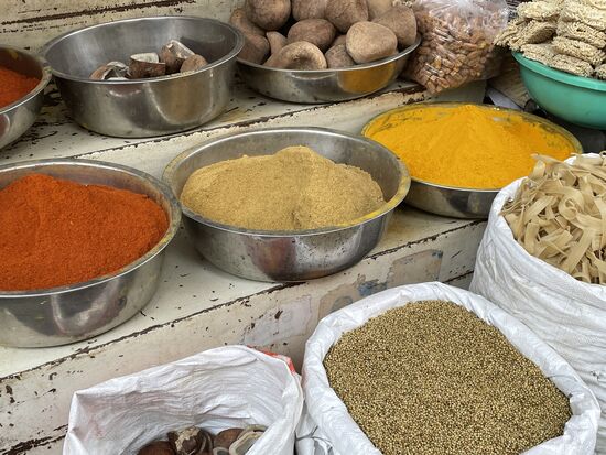 Zuerst komme ich zu den Düften, den Gewürzen und Trockenfrüchten. Und zu einem duftenden Seifenstand, der mitten in den Gewürzen seine eigenen Düfte verbreitet.