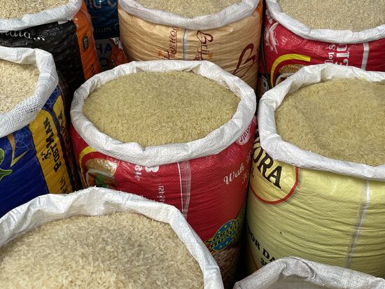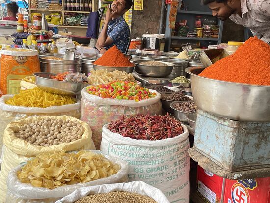 Dann kommen die Farben die für Lebensmittel gebraucht werden. Kurkuma, Curry, Chilli, Gewürzmischungen. Verschiedene Getreide und Reissorten.