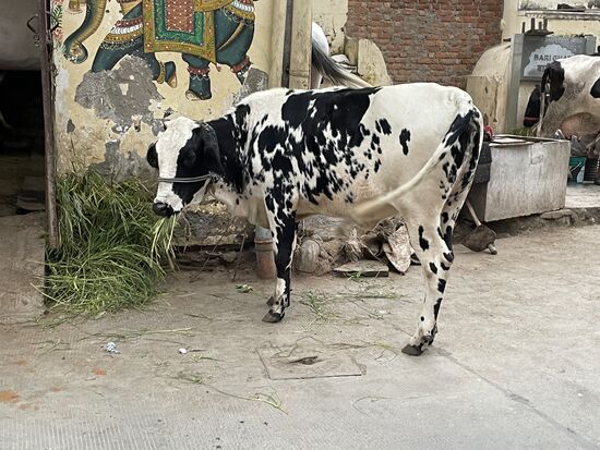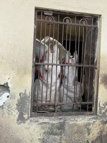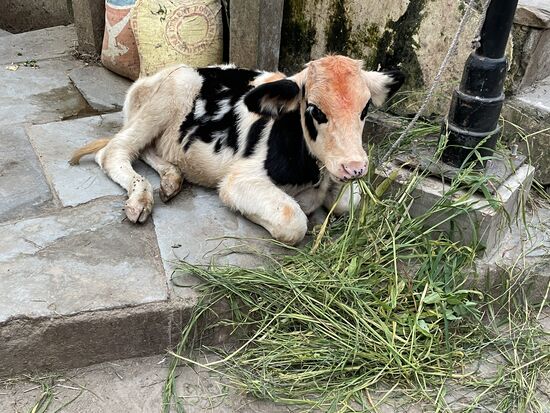 Später, auf dem Weg zum Museum, wo die Folklore-Show stattfinden wird, entdecke ich tatsächlich so etwas wie einen Stall. Mitten im Ort werden ein paar Kühe gefüttert und gemolken. Im Stall hinter dem schmalen Fenster kann ich zwei Schimmel erkennen, die aus einem Futtersack fressen. Ein ungewöhnliches Bild. So auch das Kalb, das auf dem Trottoir liegt und Gras frisst. Irgendjemand scheint also immer für die Tiere zuständig zu sein, auch wenn diese mitten in der Stadt leben.