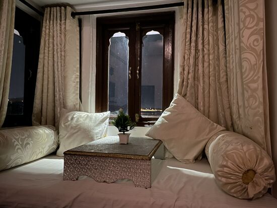 Das ganze Restaurant ist romantisch rot beleuchtet, irgendwo brennt ein Räucherstäbchen und das Essen ist sehr gut. Am Schluss brauche ich nur zwei Treppen hinunter zu steigen und bin bereits in meinem Zimmer - mit dem romantischen Erker. Gute Nacht.