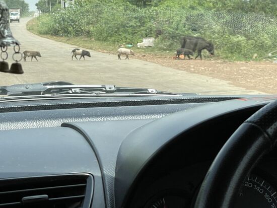 Doch zuerst müssen die 350 km geschafft werden, das heisst gute 7 Stunden Fahrt. Sie ist auch heute wieder äusserst abwechslungsreich. Als erstes begegnen uns Schweine auf der Fahrbahn, es sind natürlich nicht die ersten auf der Reise, aber die ersten, die ich fotografieren kann. Es braucht immer einen Moment, bis ich mein Handy bereit habe und dann sind sie meistens bereits vorbei.