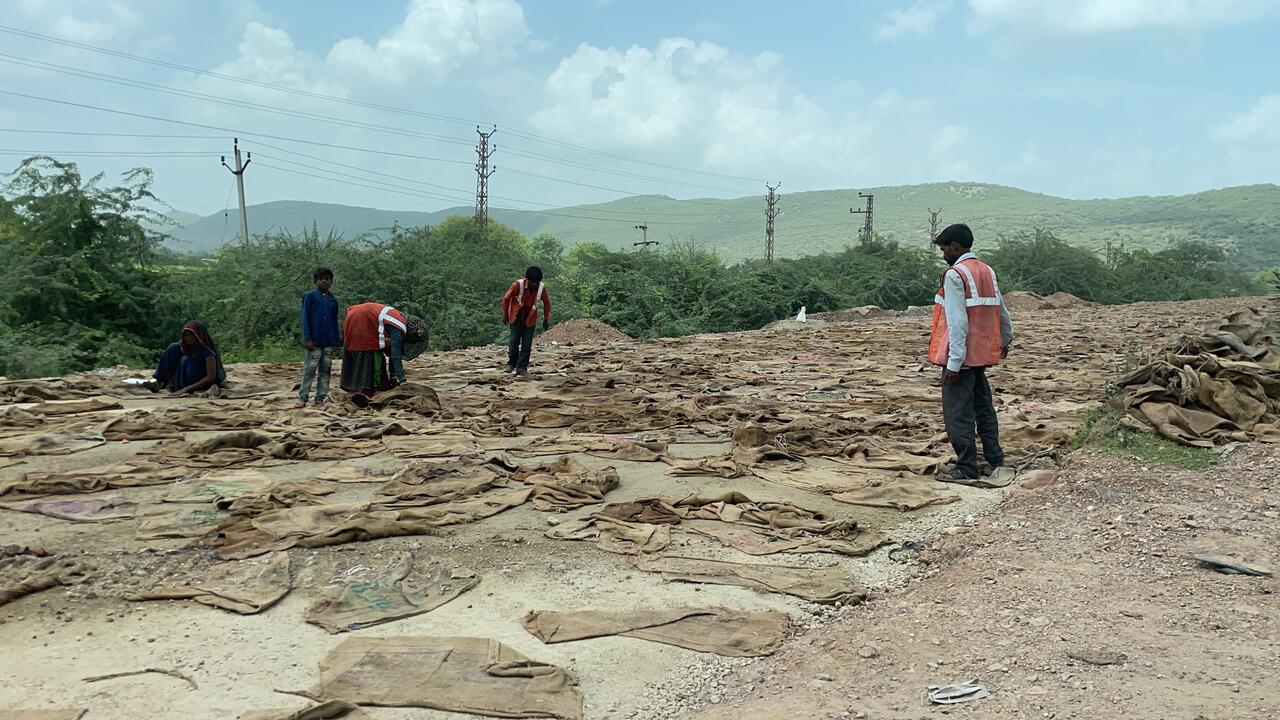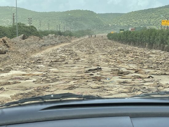 Und plötzlich rumpelt es unter dem Auto. Ich schaue hinaus und kann im ersten Moment gar nicht verstehen, was da los ist. Das ist keine Strasse, das ist eine Baustelle. Auf der Erdunterlage verteilen ein paar Leute Säcke. Nasse Reissäcke, erklärt Nipendra. Damit das Fundament nicht austrocknet. Später wird darauf der Asphalt aufgetragen. Aber die Strasse ist ja noch gar nicht fertig, warum fahren wir bereits darauf?