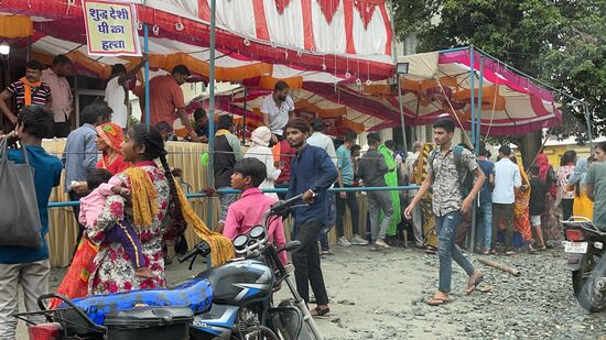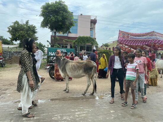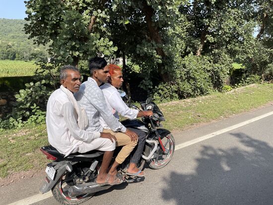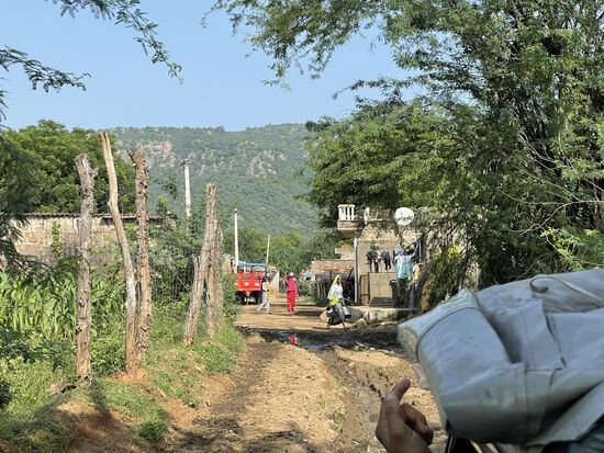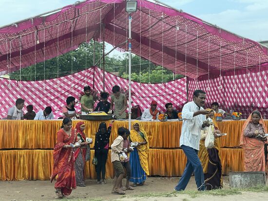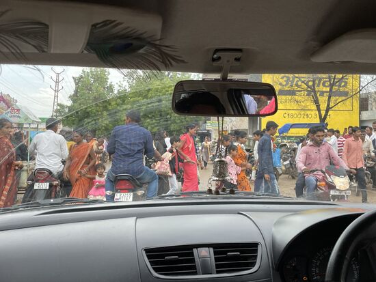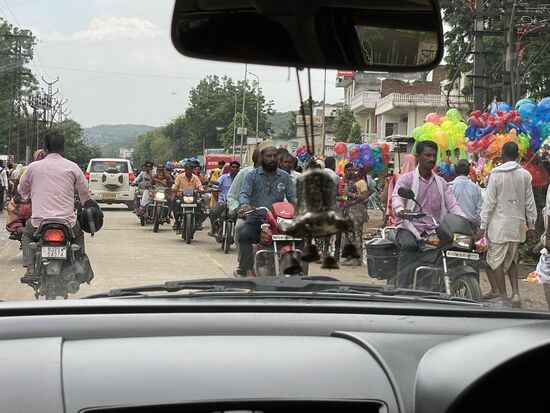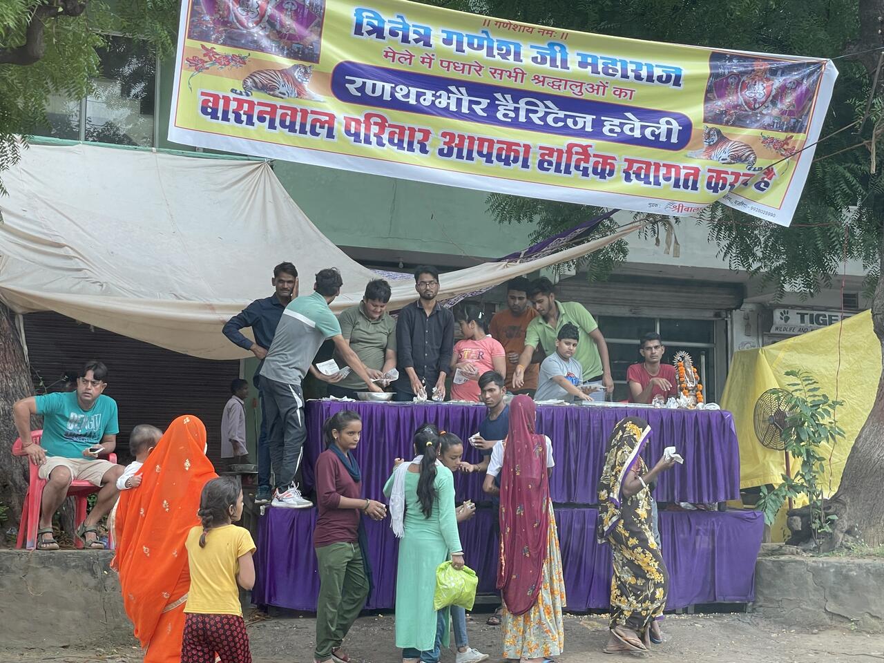 Allerdings braucht es jetzt noch einmal viel Geduld, denn der Verkehr wird immer dichter. Es zeichnet sich ab, dass im Dorf Rantambore ein Ganesha-Festival stattfindet. Der Ort ist voller Pilger, voller Motorräder, voller Musik aus allen Lautsprechern und es ist fast kein Durchkommen mehr. Ein paarmal bleiben wir stecken, Nipendra hupt sich den Weg frei. Am Strassenrand stehen Zelte, es wird Essen abgegeben. Die Leute werden verpflegt. Und über allem dröhnt Musik. Es gibt Verkaufsstände mit Spielzeug für die Kinder, mit Ballonen, Tüchern, farbigen Souvenirs und Luftballonen. Und überall hängen Transparente in allen Farben