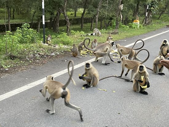 Bevor wir losfahren holen wir in zwei anderen Hotels noch einen Amerikaner und drei Franzosen ab. Dann kann es losgehen. Weit hinter den Hügeln geht gerade die Sonne auf, als wir den Eingang zum Nationalpark passieren. Doch darauf können wir keine Rücksicht nehmen, wir sind heute auf Tigerjagd und nicht darauf aus, Sonnenaufgangs-Bilder aufzunehmen. Auch an der Affenbande, der jemand einen Bund Bananen hingeworfen hat, fahren wir vorbei. Wahrscheinlich sollen sie uns in die richtige Safari-Stimmung bringen.