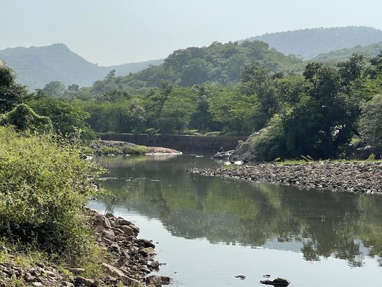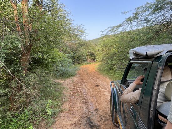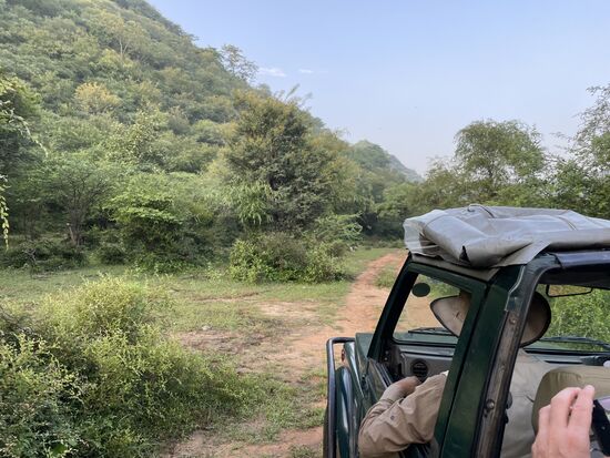 Es geht hinaus in die Wildnis. Leider kann ich die Erklärungen des Guide nicht verstehen, denn die Strasse ist so holperig, dass ich vor allem damit beschäftigt bin, mich auf dem hinteren Sitz festzuhalten, um nicht dauernd herumgeschüttelt zu werden. Aber wenigstens konnte ich die Grösse in Erfahrung bringen: 400 km2, das entspricht etwas mehr als der Hälfte des Kanons Glarus (Schweiz). Gut 80 Tiger leben heute hier, aber es gibt auch noch andere Raubtiere wie Leoparden, Hyänen, Lippenbären. Und wir fahren da einfach so im offenen Jeep durch die Gegend. Ich hoffe, die wissen, was sie tun. Im Safaripark von Mumbai waren die Fenster der Busse schwer vergittert, hier scheinen die Raubtiere friedlicher zu sein.