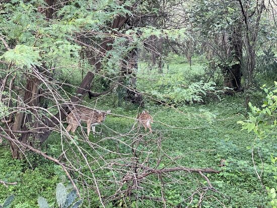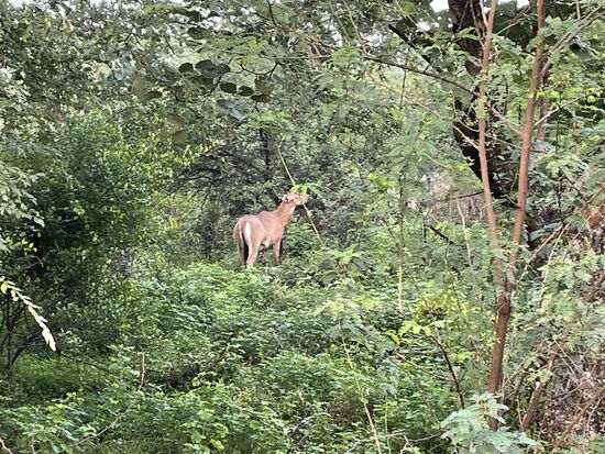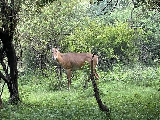 Bald treffen wir eine Gruppe gepunktete Rehe, Axishirsche und später eine grosse Antilope, eine weibliche Nilgau, die friedlich an einem Baum äst. Später sehen wir noch ein Männchen, aber nur von hinten.