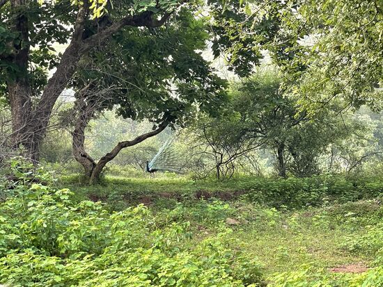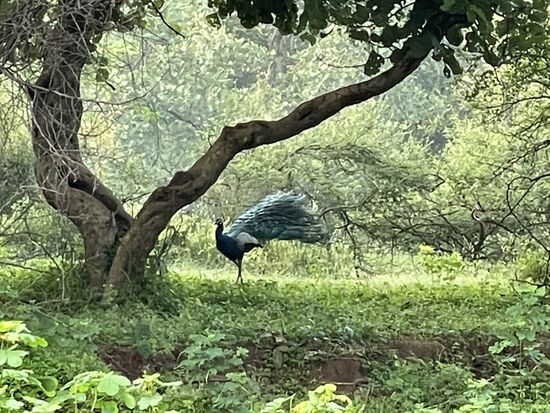 Und dann entdecken wir doch noch einen Pfau in einer kleinen Lichtung, der grad dabei ist, seine Schwanzfedern aufzustellen. Bestimmt ist irgendwo ein Weibchen in der Nähe, dem er Eindruck machen will. Ein schönes Bild.