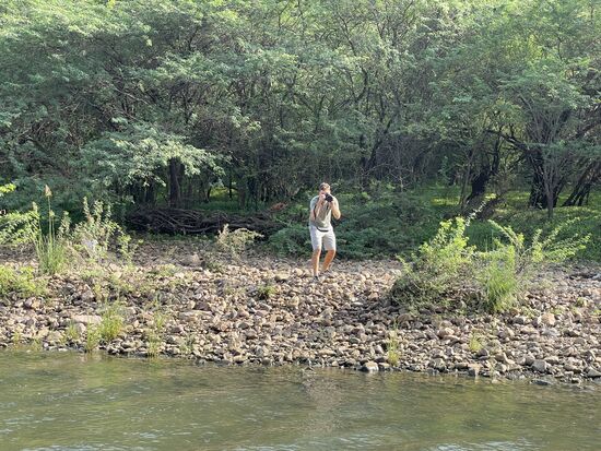 Auf dem Rückweg überqueren wir einen kleinen Fluss, was den einen Franzosen, den mit dem riesigen Objektiv, mit dem er bestimmt wunderare Tigerfotos gemacht hätte, auf die Idee bringt, den Jeep dabei zu fotografieren. Also steigt er aus, bleibt am Ufer stehen, während wir noch einmal zurück fahren und dann das Wasser noch einmal durchfahren. Damit hat er bestimmt gute Bilder bekommen, die unsere abenteuerliche Fahrt durch den Dschungel perfekt dokumentieren.