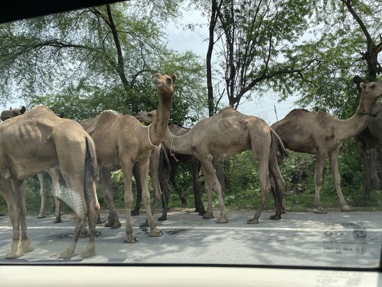 Wir sind kaum losgefahren, als ich meinen Augen nicht traue, eine ganze Kamelherde steht da am Strassenrand. Jetzt fehlen nur noch Elefanten.