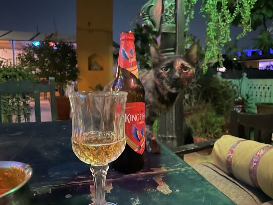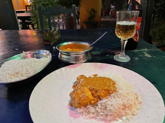 Es ist ein riesiges Zimmer und ein riesiges Bett, wo ich mich erst einmal hinlege. Ich bin völlig geschafft, will eigentlich nur noch schlafen. Doch da es in diesem Hotel auch ein Restaurant hat, das ausserdem oben auf dem Dach ist, gehe ich später hinauf und lasse mir ein Paneer (Frischkäse)-Curry mit Reis schmecken. Dabei bekomme ich sogar noch Besuch. Eine kleine schwarze Katze mit roten Flecken steht plötzlich hinter meinem Bier.
