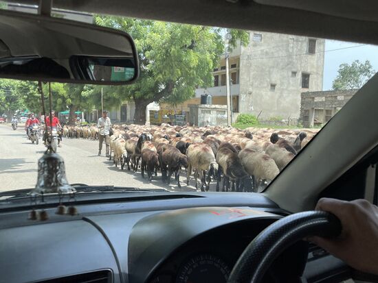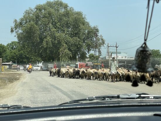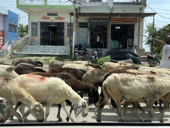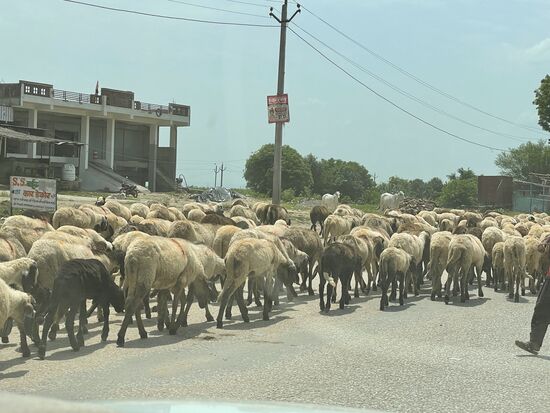 Elefanten und Tigern sind wir keinen begegnet, aber es gab noch einmal eine Kamelkaravae und danach fing es mit den Schafen an. Eine ganze Herde kam uns entgegen, sicher 50 Tiere. Sie waren grad an uns vorbei, als eine weitere Herde kam und dann noch eine und noch eine. Ich weiss nicht, woher die alle kamen und vor allem wohin die alle wollten, aber uns sind auf einem kurzen Abschnitt bestimmt 10 Herden entgegen gekommen, es wollte überhaupt nicht mehr aufhören.