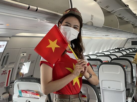 Es ist der 1. September, ich fliege mit einer vietnamesischen Fluglinie. Vietnam feiert am 2. September seinen Nationalfeiertag, darum begrüssen uns die Flugbegleiterinnen mit der Vietnamflagge.