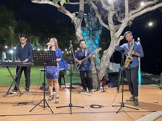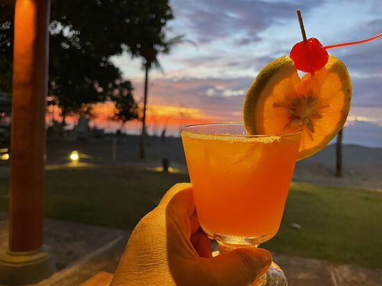 Erst am Abend gehe ich ins Restaurant, das ein paar Drinks auf der Karte hat und ein paar einfache Gerichte anbietet. Nasi Goreng zum Beispiel, oder Burger, Paella oder Spaghetti marinara. Dazu spielt jeden Abend eine kleine Liveband alte internationale Hits.