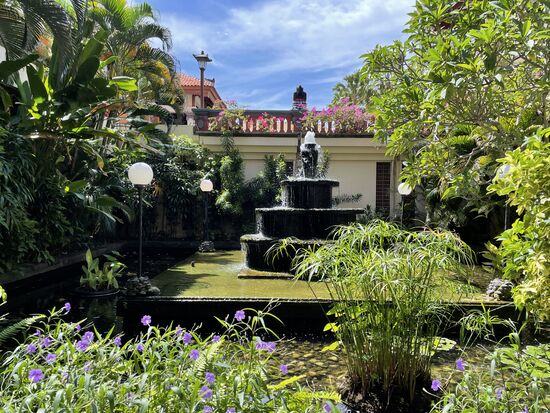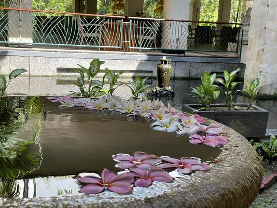 Mich begeistern auch die kleinen Wasserspiele und die Teiche mit den Kois, die beim Frühstücksrestaurant sind. Auch die Schale mit dem Wasser, die alle paar Tage mit Frangipani neu ausgelegtwird, bieten wunderbare Fotosujets.