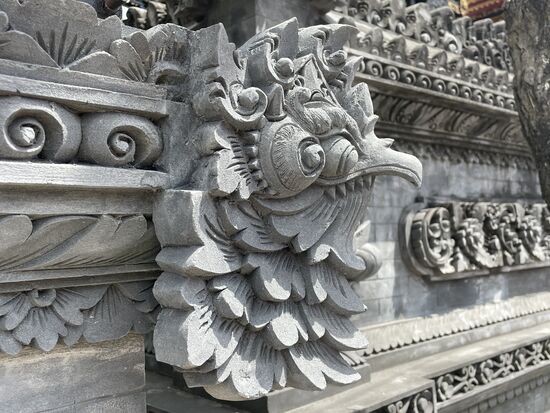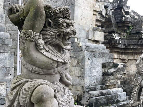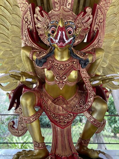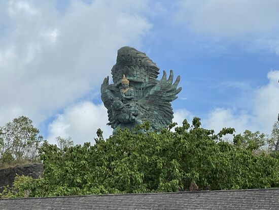 Wir haben kaum die Stadt hinter uns gelassen, als ich links eine hohe Statue entdecke. Ist das etwa...? Ja es ist sie, die riesige 75 meter hohe Statue, die ich bei meinem Anflug von weitem gesehen hatte und nicht wusste, was es sein könnte. Es ist die Garuda-Wisnu-Kencana-Statue und stellt das Reittier, den riesigen Garuda-Vogel dar, auf dem Vishnu reitet. Sie ist mitsamt dem 46 Meter hohen Sockel ganze 121 Meter hoch. Ich muss anscheinend meine imaginäre Liste der höchsten Staturen der Welt wieder revidieren. Kommt wohl immer darauf an, ob man den Sockel mitzählt.
