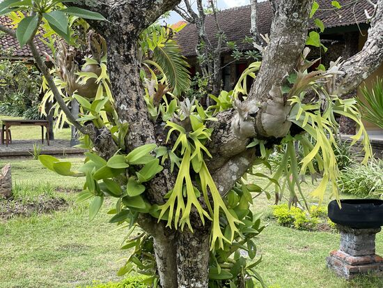 Die Rezeption ist verwaist, aber im Garten arbeiten zwei Frauen. Es gibt einen kleinen Teich mit einer echten Lotusblüte und viele Geweihfarne. Eine echte Oase. Ich komme mit einer grossen Foto-Ausbeute zurück ins Resort, vom Ort habe ich kaum etwas gesehen.