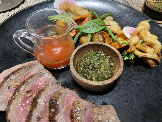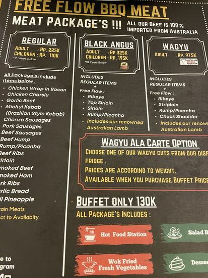 Vor allem ist es extrem laut, ich kann die nette Bedienung nicht verstehen, als sie mir erklärt, wie der Ablauf ist. Doch nachdem ich den normalen BBQ bestellt habe, sehe ich, dass ich mich am Buffet mit Salaten und Beilagen eindecken kann und dann kommen auch schon die Kellner mit ihren Fleischspiessen. Ja, genauso wie in Rio. Solange mein Pappdeckel grün anzeigt, kommen sie regelmässig vorbei. Bieten Würstchen, Speckröllchen, Pouletstücke, Schweinsbraten und Rindssteak und -Filet an. Dazu kommen die sehr feinen Ananas, ebenfalls vom Grill.
