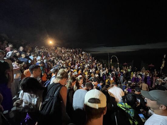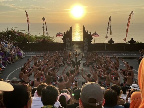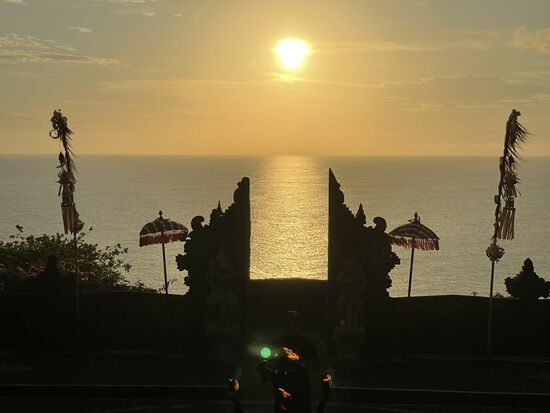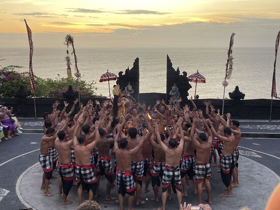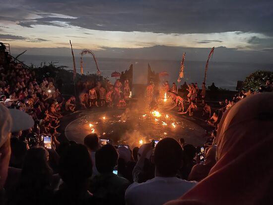 Ich bin frühzeitig da und mein Taxifahrer meint, sich solle doch vorher noch den Tempel besuchen. Aber frühzeitig zurück kommen, um einen guten Platz in der Zuschauerarena auszusuchen. Überall tummeln sich kleine Affen. Es sind Makaken und ich nehme mir vor, bein Fotografieren ganz besonders auf mein Handy aufzupassen. Will nicht, dass mir einer der kleinen Kerle mit dem Handy abhaut. Ich halte die Kamera also mit beiden Händen fest, als ich den Blick über die Klippen festhalten will. Da springt mir etws ins Gesicht. Ich komme gar nicht dazu wirklich zu merken, was passiert, greife aber auf meine Nase und kann meine Brille grad noch festhalten, die mir der alte Affe, den ich vorhin fotografiert habe von der Nase gerissen hat. Ein Glas ist herausgefallen, aber es ist noch da. Ich brauche eine ganze Weile, bis ich mich von diesem Schrecken erholt habe und die Lust am Tempel oder an der Aussicht ist mir grad gründlich vergangen.