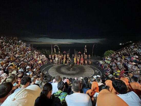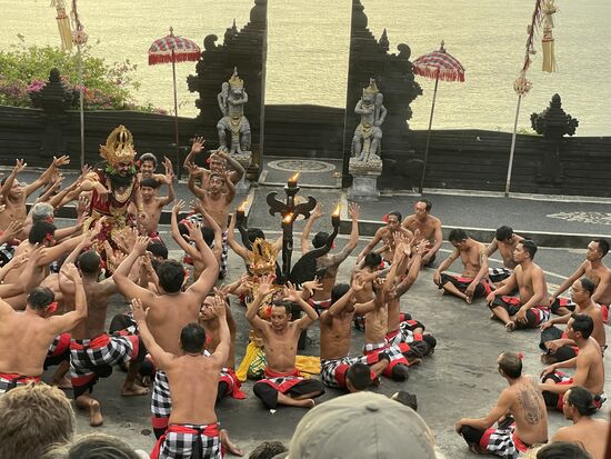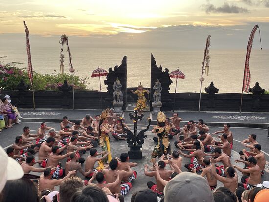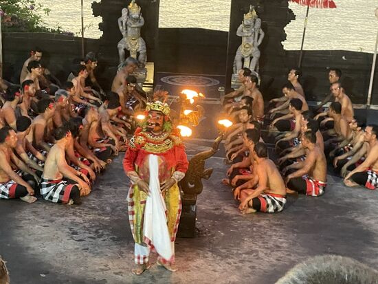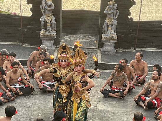 Es ist ein gewaltiges Spaktakel mit reichen balinesischen Kostümen, tanzenden Göttern, Märchenfiguren, einem Happy End und einem zerstörerisch guten Gesang der Sänger, die tatsächlich fast ununterbrochen ihren Kecak Kecak intonieren. Eine Riesenleistung.