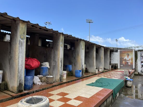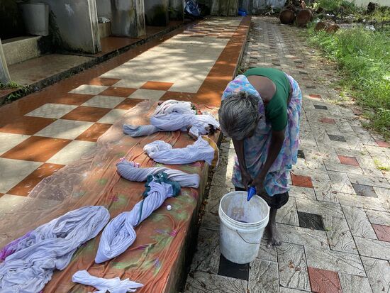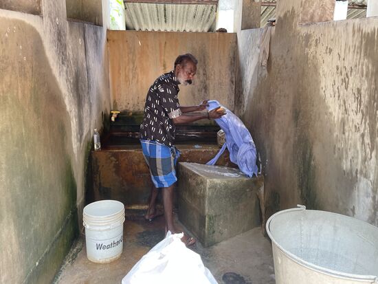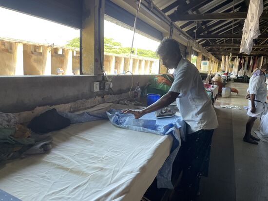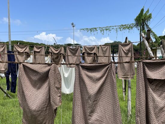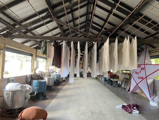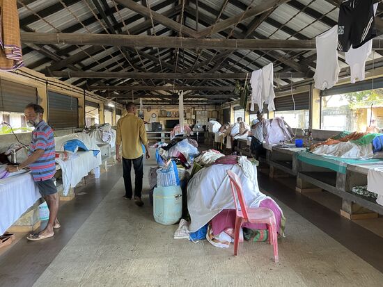 Im langen Gebäude ist die Glätterei untergebracht. Hier werden Tücher geglättet, Blusen und Hemden sorgfältig gebügelt und in gleichmässigen Stapeln zum Abholen bereitgestellt. Faisa nennt mir den Preis für ein Hemd: 40 Rupien, umgerechnet wären das 5 Franken für 10 Hemden. Gewaschen, gestärkt und gebügelt.
