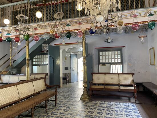 Zur Synagoge führt eine schmale Gasse, die Fussgängern vorbehalten ist. Faisa wartet am Anfang der Strasse, während ich durch die vielen Geschäfte zur Synagoge gelange. Stolz ist man hier auf den Boden aus handbemalte chinesischem Porzellan. Es ist eine Mischung aus verschiedensten Kulturen und Einflüssen. Die Kronleuchter kommen aus Belgien,