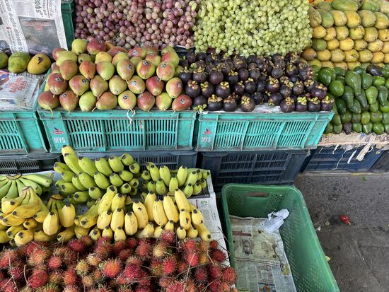 Wir fahren am Früchtemarkt vorbei. Hier möchte ich fotografieren und komme schnell mit ein paar Jungs von einem Verkaufsstand ins Gespräch. Der Verkäufer lässt mich eine Rambutan versuchen und ich kaufe ein paar davon, zusammen mit einigen Mangostasen und kleinen süssen Bananen. Jetzt noch ein gemeinsames Selfie, und schon hab ich einen neuen FB-Freund und eine Alternative, falls ich auch heute kein richtiges Restaurant fürs Nachtessen finde.
