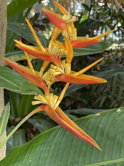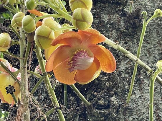 Ich liebe Vogelparks und Zoos nicht nur wegen den Tieren, sondern genauso, weil es da meist alte und exotische Bäume gibt. Und ich werde auch hier nicht enttäuscht, denn schon auf den ersten Wegen begegnet mir ein riesiger Kanonenkugelbaum. Schon im Zoo von Mumbai hatte es ein paar davon, aber sie trugen nur die schweren Kugeln. Blüten hatte ich vergeblich gesucht. Der hier aber trägt sowohl Früchte, wie auch Blüten. Und zwar tief genug am hohen Stamm, so dass ich sie gut fotografieren kann. Sie sind mit ihren dicken Blütenblättern und den eigenartig geformten Staubgefässen ganz speziell schöne Exoten. Und ausserdem sind diese orange, bisher hatte ich nur die rosa Variante gesehen.
