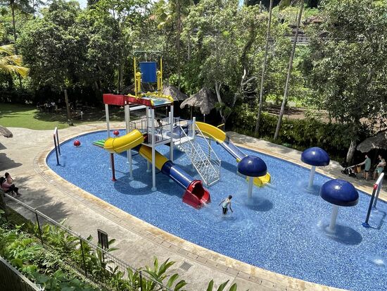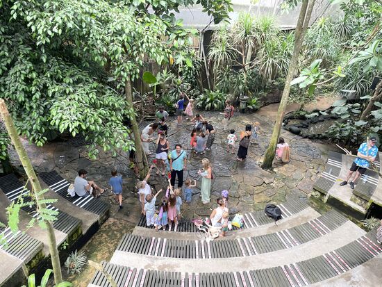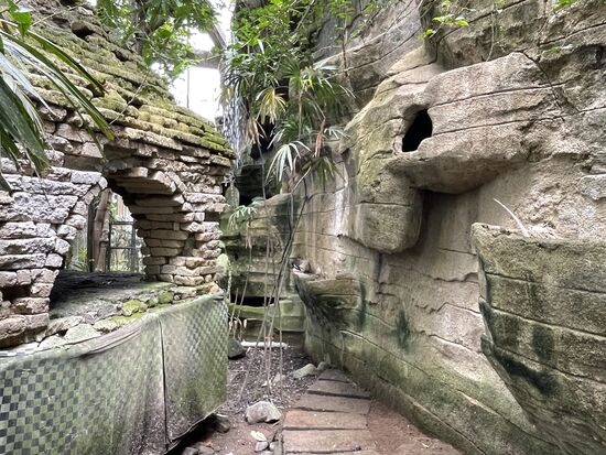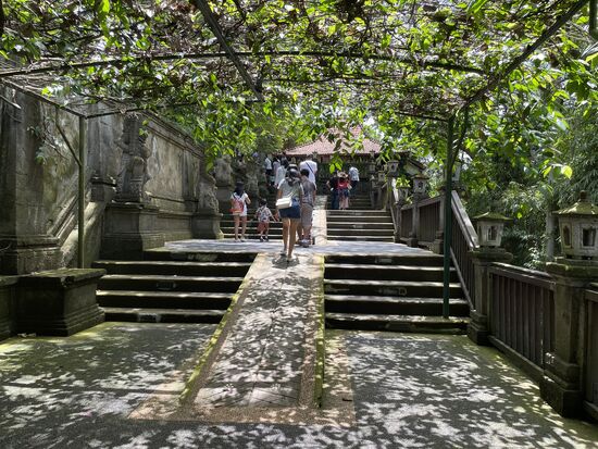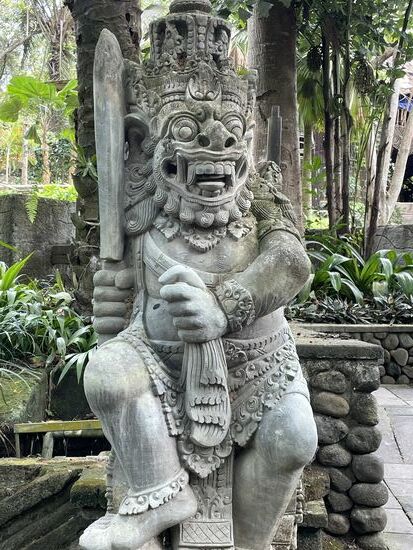 Erst dann kommt der eigentliche Eingan zum Zoo, es geht unter einer schattigen Arkade, ein paar Stufen hinauf. Wobei auch dieser Ort, wie an vielen Orten in Bali Rampen gebaut wurden. Für Rollstühle oder Kinderwagen. Begleitet werde ich von einer Galerie steinerner Dämonen. Oder sind es Götter? Wächter? So genau ist das für mich nicht ersichtlich, aber sie begleiten mich bis zum Shuttlebus, vorbei am grossen Kinderspielplatz.