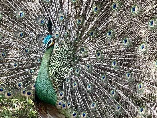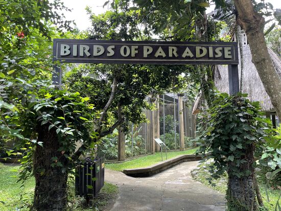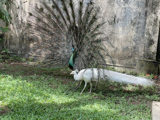 Beim Schlendern durch den Park entdecke ich noch viele farbenfrohe Vögel. So schlägt auch der Pfau hinter dem traditionellen indonesischen Haus ein Rad und stolziert rund um seine Hennen. Das ist doch einfach immer wieder ein schönes Bild.
