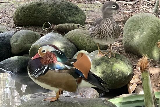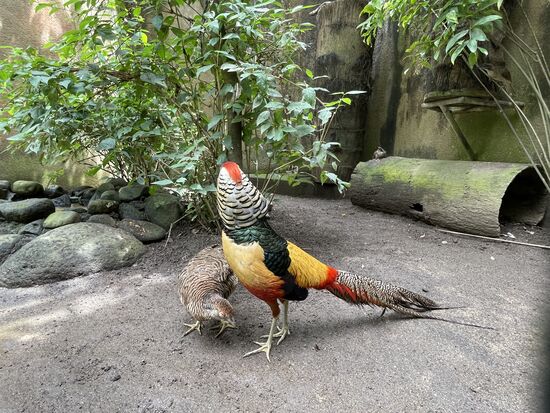 Ich bin inzwischen in einem grossen Gehege, das mit seinen hohen Bäumen und dem kleinen Wasserlauf an eine Dschungelszene erinnert. Nur ist das alles nicht extra angelegt, sondern es wurde einfach ein grosses Gehege um einen Teil des Geländes gelegt. Hier drin stolzieren die Kraniche, picken die Fächertauben, schwimmen die farbigen chinesischen Enten. Immer schön zu zweit. Und ein paar Fasane gesellen sich auch noch dazu. Ein Parkwächter erzählt den Kinder, die mit ihren Eltern da sind, von den Vögeln und lässt sie sie dann füttern. Sie dürfen ihnen Körner ausstreuen oder gar kleine Häppchen entgegenhalten, die sie ihnen dann aus den kleinen Fingern picken.