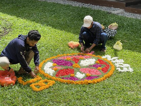 Beim Restaurant sind zwei Männer dabei, ein Mandala aus Blumen zu machen. Es wird heute noch ein Geburtstag hier gefeiert, das Ornament ist eine spezielle persönliche Dekoration, erklärt mir der eine, auf meine Frage.