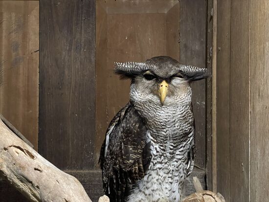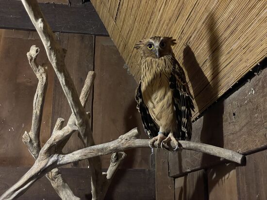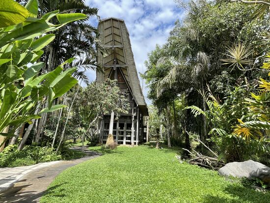 Das Haus stammt von der Insel Sulawesi und war den vornehmeren Familien vorbehalten. Hier im Park leben darin ein paar Eulen. Ernst hocken sie auf ihren Ästen und blinzeln den Besucher gelegentlich aus dem Halbdunkeln an.