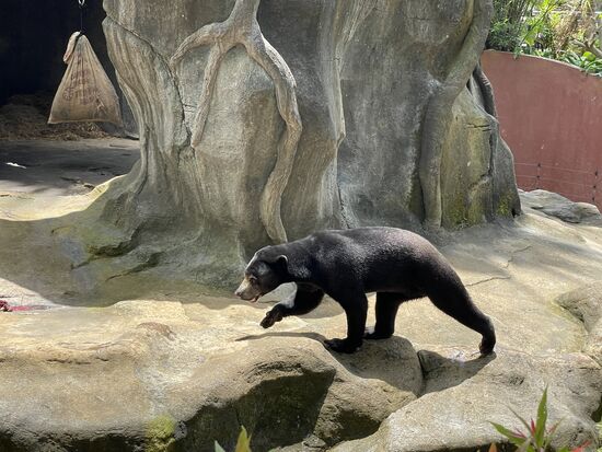 Ich schaue eine Weile dem Bären zu. Ist der ganz allein, will ich von einer der Wärterinnen wissen. Nein, lacht sie, die sind zu dritt, aber sie haben Schichtbetrieb, im Moment ist er zuständig für die Zuschauer, die anderen dürfen sich ausruhen. Nun, das mit der Unterhaltung für die Besucher macht er sehr gut. Er klettert über die Felsen planscht kurz im kleinen Pool und suhlt sich an der Sonne.