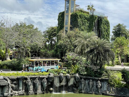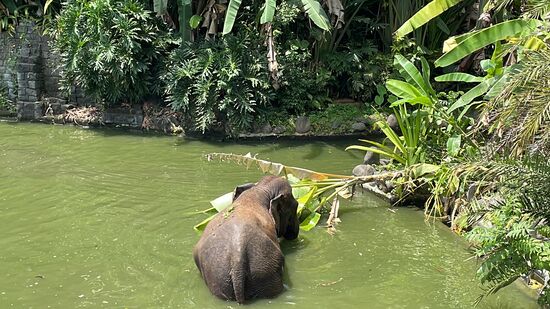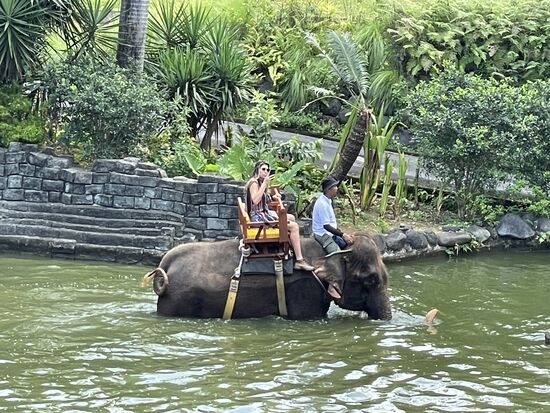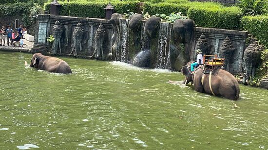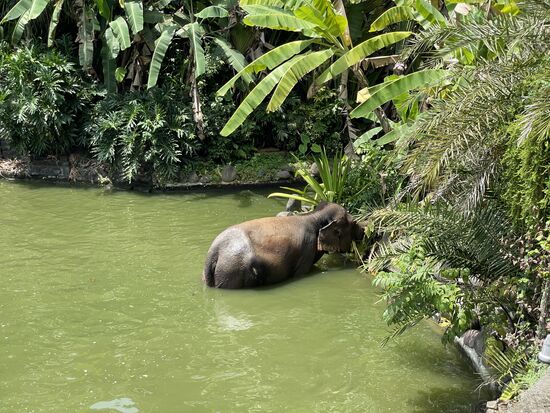 Der Shuttlebus fährt mich bis zu den Hauptattraktionen, nämlich zu den Elefanten, die einen grossen Teich haben. Man kann gegen einen Aufpreis auf den Elefanten reiten, zwei führen grad Leute durch das Wasser. Und nachdem ich ausgestiegen bin und über die Brücke zu den Elefanten gehe, sehe ich unter mir einen Elefanten mit einer Frau auf dem Rücken durchgehen. Später beobachte ich den Teich und sehe die Frau wieder, wie der Elefant jetzt mit ihre durch das Wasser watet. Ich trinke einen Fruchtsaft, filme ein wenig, mache Fotos und winke der Frau. Sie winkt zurück und nachdem sie abgestiegen ist, suche ich sie. Sie steht beim Kiosk, wo man die Fotos vom Elefantenritt kaufen kann. Ob sie meine Fotos wolle, frage ich sie. Natürlich ist sie hoch erfreut und zeigt mir dann, wie man Fotos direkt von IPhone zu Iphone übertragen kann, ohne das Wlan einzuschalten. Ich wusste das, aber ich wusste nicht, wie man das macht. Habe jetzt wieder was gelernt.